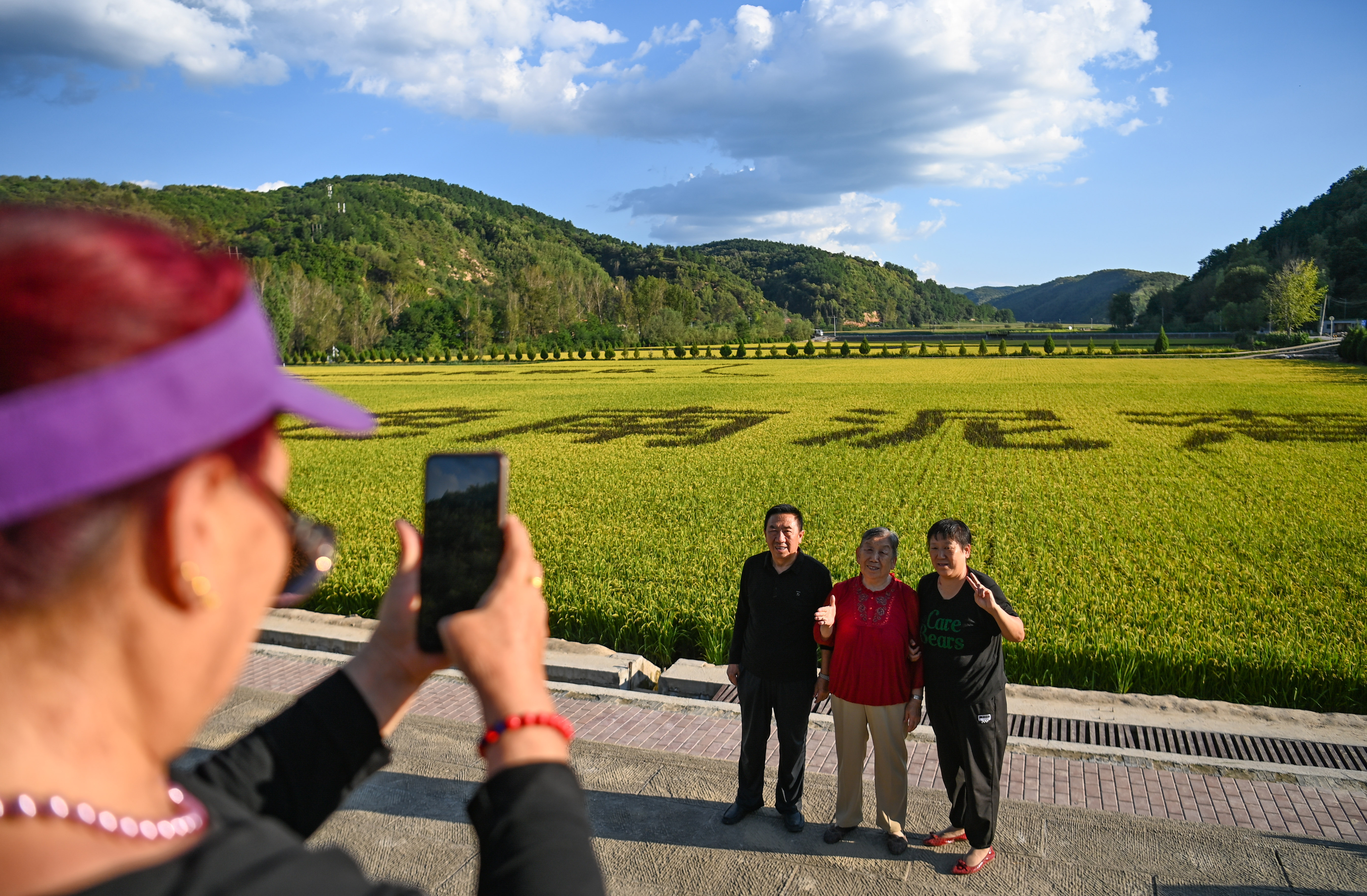 8月29日,游客在陜西延安南泥灣國家濕地公園的稻田前留影。新華社記者 鄒競一 攝