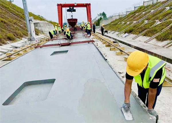 梅龍高鐵時速350公里,采用的是CRTS雙塊式無砟軌道結(jié)構(gòu),從上到下由鋼軌、扣件、軌枕、道床板、隔離層和底座等部分組成,無砟軌道的平整度決定著列車行駛的平穩(wěn)性和舒適性?;炷寥肽囟软毧刂圃?——30攝氏度才能確保質(zhì)量,為此項(xiàng)目部將施工作業(yè)時間進(jìn)行了調(diào)整,避開高溫時段,選在溫度偏低的早上和夜間施工,混凝土澆筑則在深夜溫度最低的時候進(jìn)行;確保無砟軌道施工質(zhì)量。