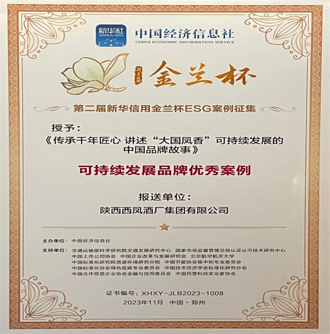 西鳳集團公司榮獲“新華信用金蘭杯可持續(xù)發(fā)展品牌優(yōu)秀案例”獎