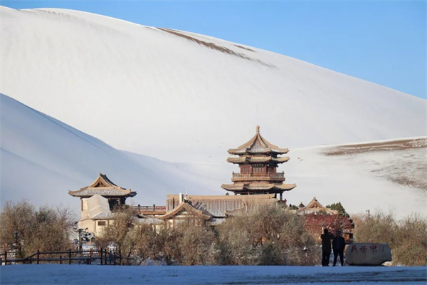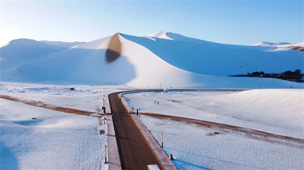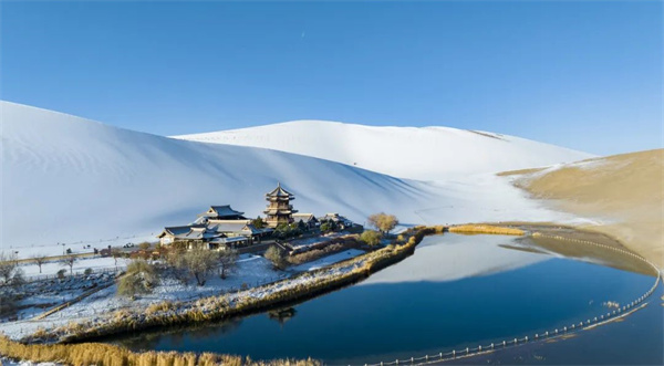 有冬要來,有雪入懷,于淺冬邂逅一場初雪的浪漫,2023年11月14日,甘肅敦煌鳴沙山月牙泉迎來今冬首場降雪,白雪鋪遍沙山峰巒,雪落成詩,滿目雪白,雪后的鳴沙山月牙泉似清逸淡雅的水墨畫,碧藍(lán)的泉水與落雪交相輝映,組成冬日盛景。