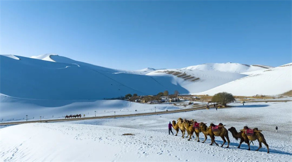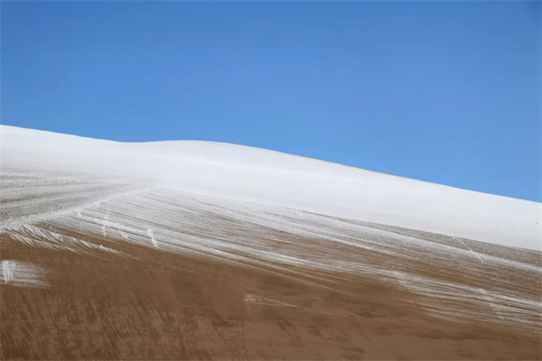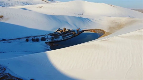 初雪降臨,鳴沙山月牙泉便又浪漫了起來,初雪似筆,將月牙泉清澈的泉水勾勒出來,猶如一彎銀月鑲嵌在沙丘之間,泉水映著沙山雪,微微泛起波紋,像是訴說鳴沙山月牙泉永恒的愛情故事,初冬的月牙泉是碧藍(lán)色的,在落雪的沙漠中俯瞰極為壯觀。