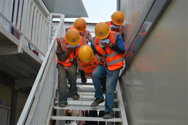 本次演練模擬施工現(xiàn)場電焊作業(yè)不慎點燃易燃材料擠塑板引發(fā)起火,引燃旁邊管理人員宿舍,導(dǎo)致一名人員疏散轉(zhuǎn)移不及時被困。演練現(xiàn)場設(shè)置了現(xiàn)場搶險、醫(yī)療救護(hù)、技術(shù)保障、物資設(shè)備保障、安全警戒、后勤保障6個應(yīng)急小組。隨著總指揮一聲令下,演練人員立即組織人員緊急疏散,對被圍困的二樓作業(yè)人員進(jìn)行救援,同時組織人員進(jìn)行滅火,參演人員按照既定路線有序逃生,安全到達(dá)指定地點。同時邀請消防支隊講解常用的消防器材及滅火設(shè)施。