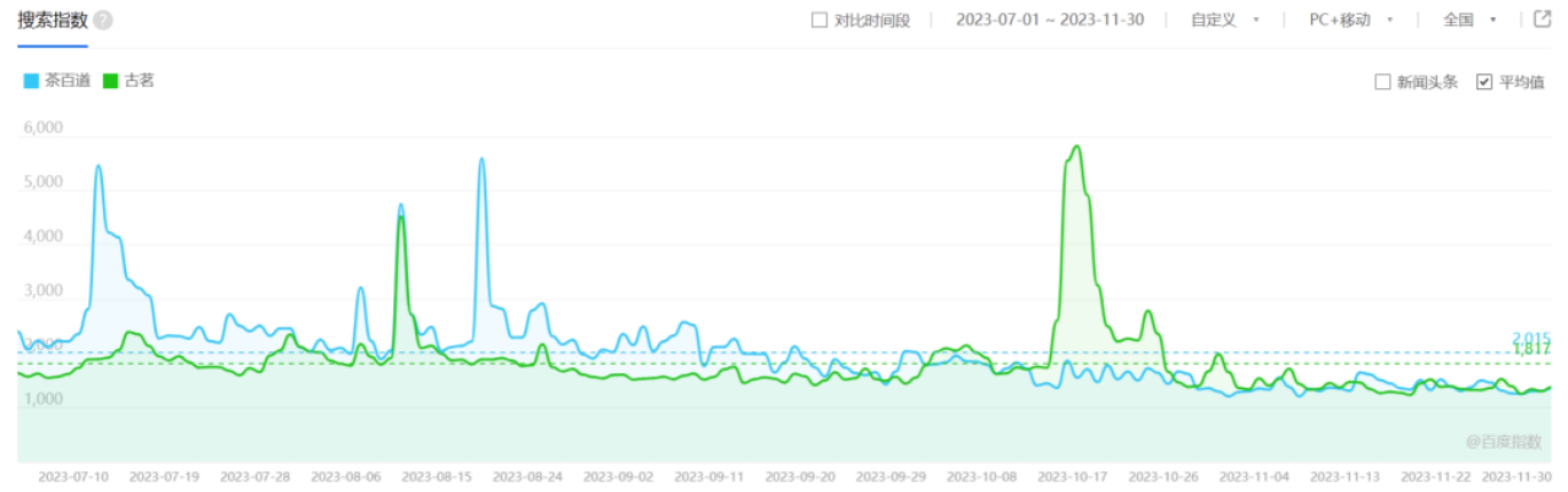 以“茶百道×未定事件簿”與“古茗×天官賜福”聯(lián)名活動為例,截至11月30日,#茶百道聯(lián)名未定事件簿#、#古茗天官賜福#微博話題閱讀量分別達(dá)到1.6億、1.3億。根據(jù)百度指數(shù),在聯(lián)名活動開啟當(dāng)天,兩個茶飲品牌的搜索指數(shù)均出現(xiàn)顯著上升,皆超出今年7-11月平均值的150%以上。聯(lián)名活動已然成為茶飲品牌的流量密碼。