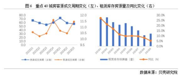 依據(jù)貝殼研究院數(shù)據(jù)監(jiān)測(cè),全國(guó)重點(diǎn)40城2023年三季度房客源成交周期分別為56.7、11.5天,房源成交周期環(huán)比減少2.1天,同比增加2.7天;客源成交周期環(huán)比延長(zhǎng)1天,同比延長(zhǎng)1天。隨著個(gè)人租賃房源供應(yīng)的增加,疊加保障性租賃住房、市場(chǎng)化集中式租賃房源的增加,個(gè)人業(yè)主出租房源出租速度減緩。從庫(kù)存房源來看,2023年1-9月租賃庫(kù)存房源量均呈現(xiàn)同比增加的趨勢(shì),與此同時(shí),租客租房面臨的選擇項(xiàng)增多,租客對(duì)于租賃房源可選類型和房源量均有增加。