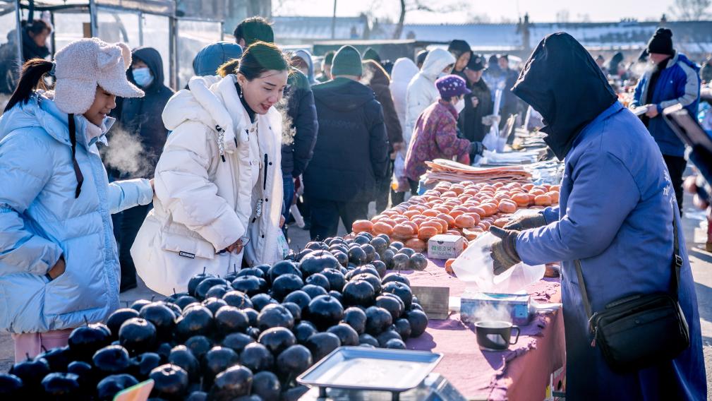 顧客在吉林省長(zhǎng)春市近郊的卡倫大集上購(gòu)買(mǎi)凍梨和凍柿子(1月18日攝)。新華社記者 唐成卓 攝