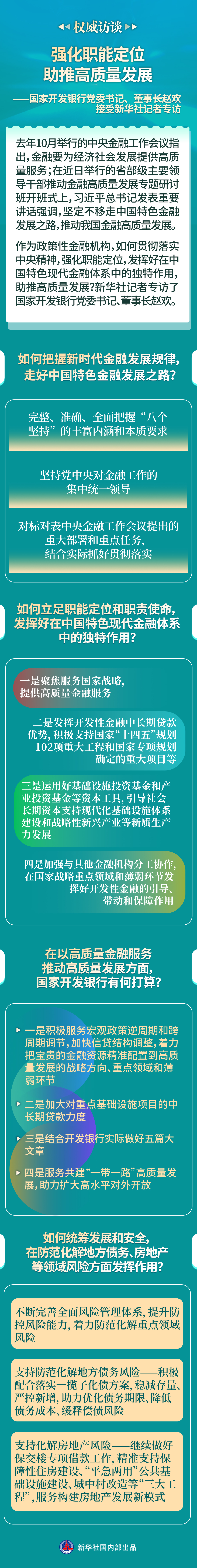 作為政策性金融機(jī)構(gòu),如何貫徹落實(shí)中央精神,強(qiáng)化職能定位,發(fā)揮好在中國特色現(xiàn)代金融體系中的獨(dú)特作用,助推高質(zhì)量發(fā)展?新華社記者專訪了國家開發(fā)銀行黨委書記、董事長(zhǎng)趙歡。