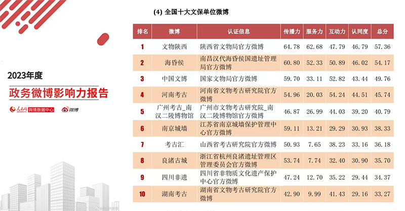 日前,人民網(wǎng)輿情數(shù)據(jù)中心聯(lián)合新浪微博發(fā)布“2023年度政務(wù)微博影響力報(bào)告”,并公布政務(wù)微博榜單,陜西省文物局官方微博“文物陜西”再次榮登“全國(guó)十大文保單位微博”榜首,并連續(xù)11年獲此殊榮。