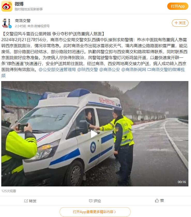 2024年2月21日7時(shí)56分,商洛市公安局交警支隊(duì)西鎮(zhèn)中隊(duì)接到求助警情:柞水中醫(yī)院有危重病人急需轉(zhuǎn)西京醫(yī)院救治,情況非常危急。此時(shí)商洛全市出現(xiàn)冰雪惡劣天氣,境內(nèi)高速公路路面積雪嚴(yán)重,能見(jiàn)度低,部分路面已經(jīng)結(jié)冰,部分路段封閉通行。執(zhí)勤民警立即與西安高交和路政取得聯(lián)系,同時(shí)聯(lián)系西京醫(yī)院做好應(yīng)急準(zhǔn)備。為使病人盡快得到救治,民警駕駛警車警燈閃爍鳴笛開(kāi)道,以最快速度開(kāi)辟一條“綠色通道”快速通行,安全護(hù)送其前往醫(yī)院,經(jīng)過(guò)商洛、西安兩地高交接力護(hù)送,病人成功轉(zhuǎn)入西京醫(yī)院得到有效救治。