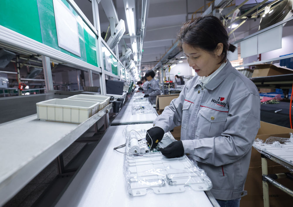 2月19日,工人在位于浙江金華市金義新區(qū)的浙江好易點(diǎn)科技股份有限公司車(chē)間內(nèi)組裝智能晾衣機(jī)。據(jù)介紹,該公司已形成年產(chǎn)智能晾衣機(jī)100萬(wàn)套生產(chǎn)能力。新華社記者 徐昱 攝