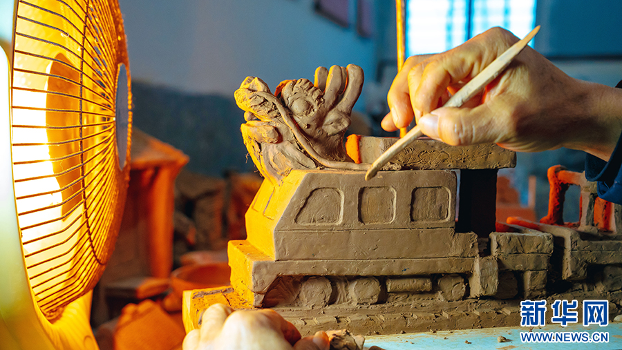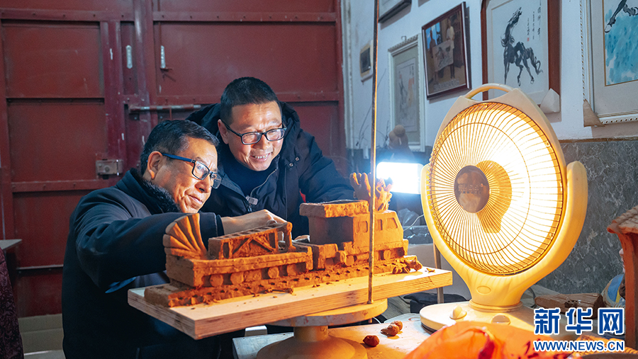 在工作室,師父黃忠詳指導(dǎo)劉建強(qiáng)(右)精雕泥塑“龍頭軌道車”。劉一江 攝