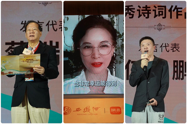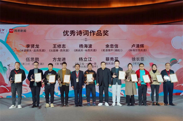 會上,王士祥、李曉東分別作了題為《詩詞山河—古典詩詞與酒》《當(dāng)代生活與傳統(tǒng)詩詞》的主題演講;網(wǎng)易文化高級主編章劍鋒公布比賽情況,與會領(lǐng)導(dǎo)為獲獎詩詞作品頒獎;獲獎代表蔡瑞義、鐘婉、伍思鵬分別作了發(fā)言;獲獎作品進行了現(xiàn)場表演展示。