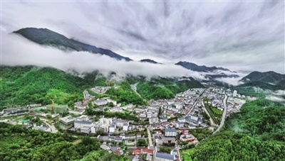 云霧繚繞的漢中市留壩縣城。張嵐 攝