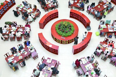 學(xué)生們?cè)诒本┩鈬?guó)語(yǔ)大學(xué)圖書館內(nèi)閱讀。新華社發(fā)