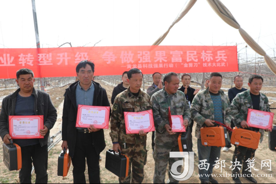西部決策網(wǎng)訊 近日,黃龍縣果業(yè)中心、三岔鎮(zhèn)人民政府在三岔鎮(zhèn)木昌橋村聯(lián)合舉辦“金剪刀”技術(shù)大比武。本次比賽特邀請西北農(nóng)林科技大學(xué)園藝學(xué)院研究員,博士生導(dǎo)師,國家蘋果產(chǎn)業(yè)技術(shù)體系延安綜合試驗站站長鄒養(yǎng)軍,以及延安市和洛川縣等地的果業(yè)專家擔(dān)當(dāng)評委。來自全縣4個涉果鄉(xiāng)鎮(zhèn)的優(yōu)秀果農(nóng)代表11人以及果業(yè)中心技術(shù)員3人參賽。