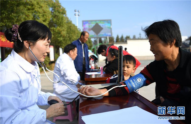 11月4日,安徽醫(yī)科大學(xué)第一附屬醫(yī)院的醫(yī)生為村民體檢。 當(dāng)日,安徽省肥西縣豐樂(lè)鎮(zhèn)邀請(qǐng)安徽醫(yī)科大學(xué)第一附屬醫(yī)院的醫(yī)生來(lái)到鄉(xiāng)村,免費(fèi)為周邊村民提供醫(yī)療咨詢(xún)、健康體檢、醫(yī)療保健等衛(wèi)生服務(wù)。新華社記者劉軍喜攝 11月4日,安徽醫(yī)科大學(xué)第一附屬醫(yī)院的醫(yī)生為村……